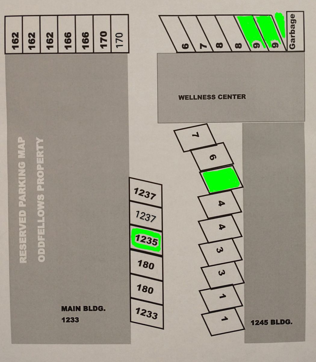 The pictured green spaces are okay to use if available. Otherwise most street parking is free. Please make sure to stay out of other businesses' spaces, as parking rules can be strictly enforced.